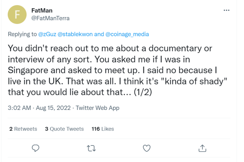 Fatman cũng nói, “Tôi không cho rằng anh hoàn toàn muốn bảo vệ Terra. Tôi nghĩ rằng anh đã “shill” Terra và Do Kwon trong một thời gian dài, và anh đã nhắm mắt làm ngơ trước những điểm yếu của họ và chỉ hành động như một kẻ nịnh hót khi có cơ hội. Với tất cả sự tôn trọng, tôi nghĩ rằng bất kỳ nhà báo nào cũng sẽ đồng ý rằng anh không phải là người trung lập nhất ở đây”.