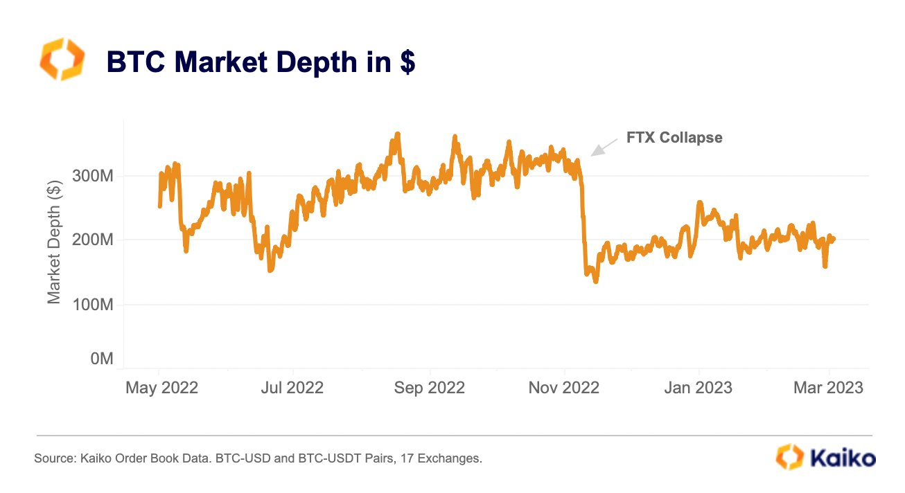 - Hệ lụy của sự kiện FTX sụp đổ đang tiếp tục ảnh hưởng đến những nhà đầu tư trong năm 2023. Market depth của Bitcoin vẫn chưa thể nào lấy lại được phong độ như trước khi sự kiện này xảy ra. Nói cách khác, đường giá BTC năm 2023 bất ổn hơn, nhạy cảm hơn 2022 rất nhiều.