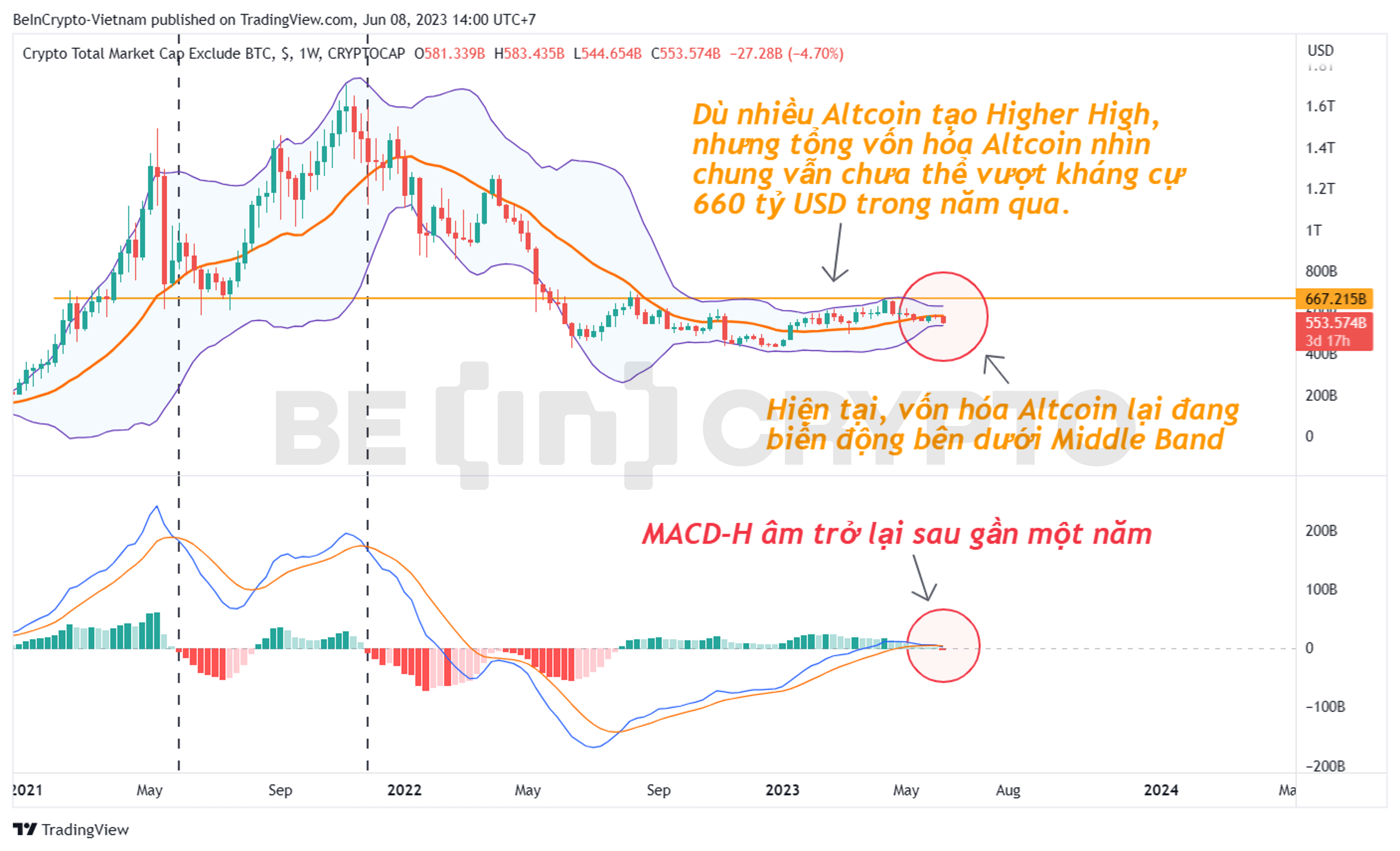- Hai ngày gần đây, vốn hóa Altcoin đã phá vỡ hỗ trợ Middle Band của chỉ báo Bollinger Band khung tuần. Đây là tín hiệu dự báo đà suy giảm của Altcoin trong tháng này. Thêm vào đó, MACD-H cũng vừa âm trở lại sau gần một năm.