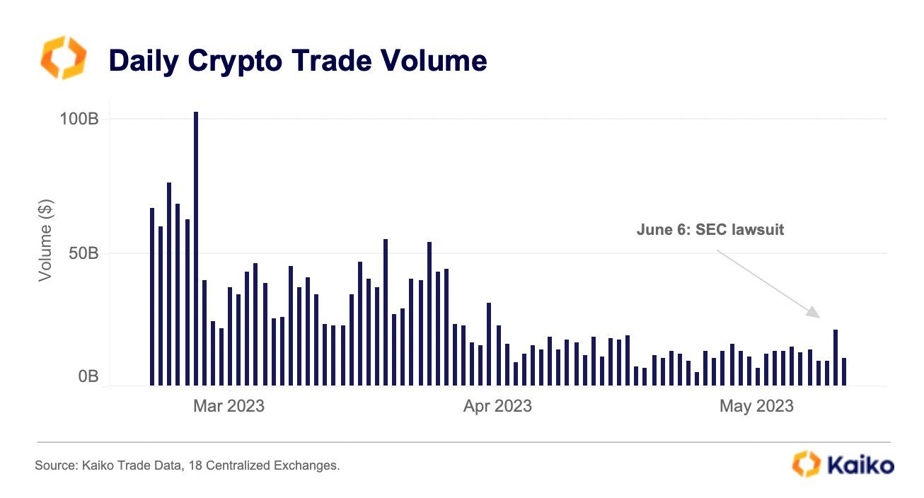 - Trong ngày 6/6, tin tức vụ kiện của SEC đã khiến cho khối lượng giao dịch tăng cao nhất kể từ tháng 4 đến nay, đạt gần 21 tỷ USD. Động thái này chấm dứt chuỗi ngày giao dịch ảm đạm của toàn thị trường kéo dài hơn 2 tháng liền.