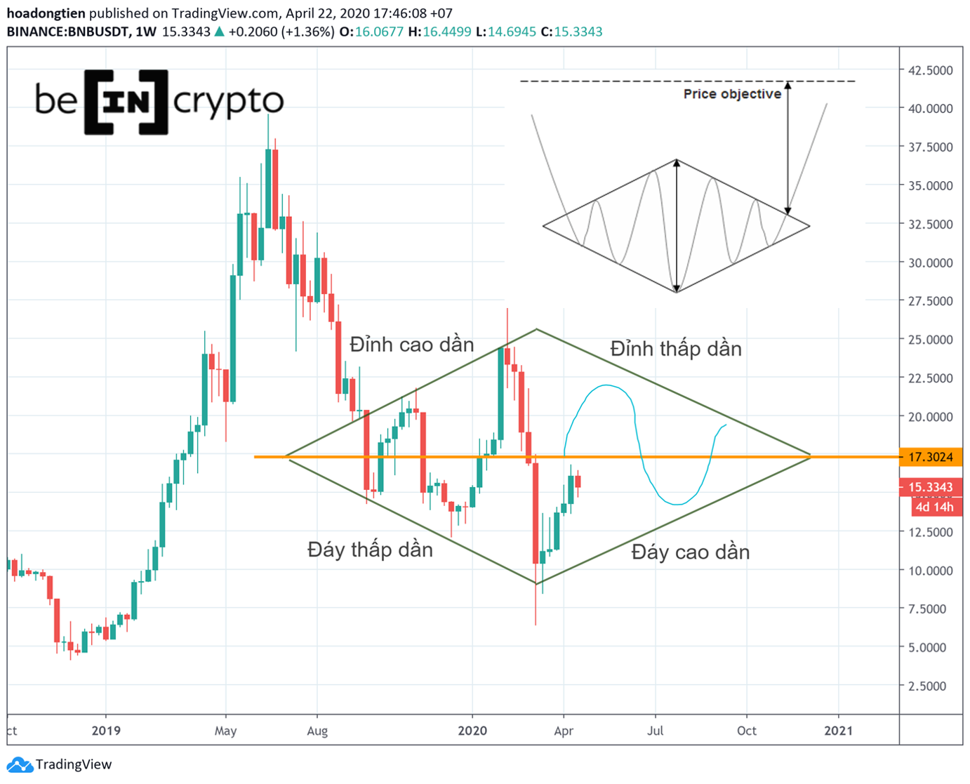 Đồ thị giá Binance Coin (BNB) gần đây cũng đã có những bước tăng rất đáng kể. Nhưng nhìn chung vẫn đang bám sát theo những biến động của giá Bitcoin. Ở góc nhìn mô hình giá, BNB liệu sẽ hoàn thành mô hình giá viên kim cương?
