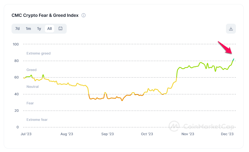 Lần đầu tiên trong năm 2023, CMC Crypto Fear & Greed Index chấm thị trường ở mức điểm trên 80 điểm, tương đương với vùng “Extreme greed”.