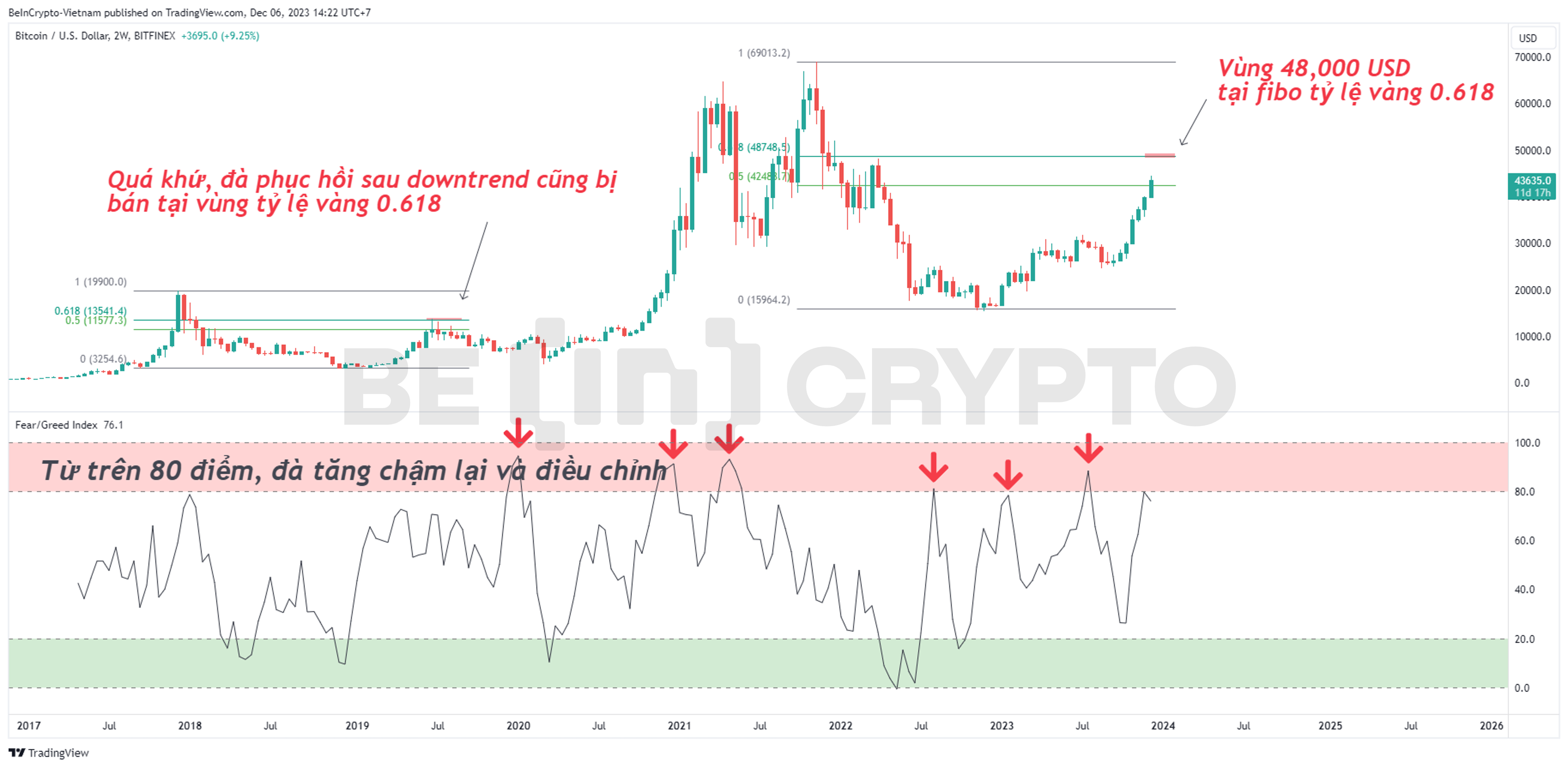 Sponsored Sponsored- Chỉ số tham lam & sợ hãi của riêng Bitcoin chạm 80 điểm và bước vào vùng rủi ro cao. Quá khứ cho thấy khi chỉ số này bước vào vùng 80 điểm trở lên thì giá Bitcoin sẽ tăng chậm lại hoặc điều chỉnh. Do đó, có thể dự doán Bitcoin có khả năng bước vào vùng sideway ở mức cao.