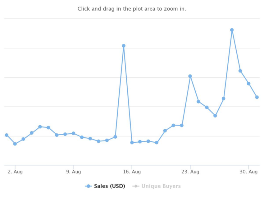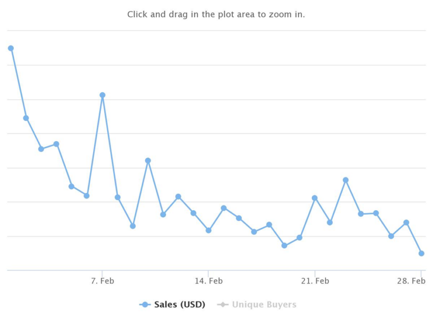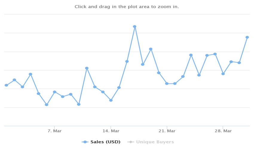 Giá trị bán hàng trung bình cho tháng 3 là 422.17 USD. Đây chỉ là một con số nhỏ so với giá trị bán hàng trung bình là 1,120.42 USD được ghi nhận vào tháng 8 năm 2021. Giá trị bán hàng trung bình cho tháng 1 và tháng 2 năm 2022 lần lượt là 655.63 USD và 429.50 USD.