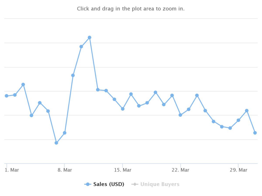 Tổng số người mua duy nhất cho tháng 3 năm 2022 là 630,461. Đây là mức giảm giá trị 30% so với từ tháng 11 năm 2021, 28% so với tháng 12 năm 2021, 33% so với tháng 1 năm 2022 và giảm 28% so với tháng 2 năm 2022.