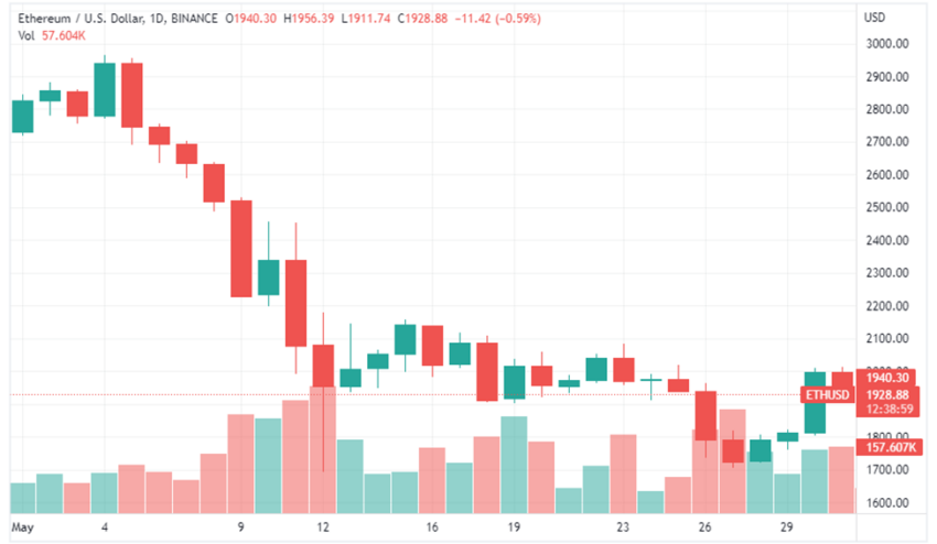Trong khi đó, vào tháng 4 năm 2022, Ethereum được giao dịch trong phạm vi từ 3,000 đến 4,000 USD cho mỗi đồng coin, trong phần lớn các ngày. Nhìn chung, ETH đã mở cửa mức 2,730 USD vào ngày 1 tháng 5 và đóng cửa vào ngày 31 tháng 5, ở mức 1,942 USD. Điều này tương đương với mức giảm 28% trong giá mở và đóng cửa của Ethereum vào tháng 5.