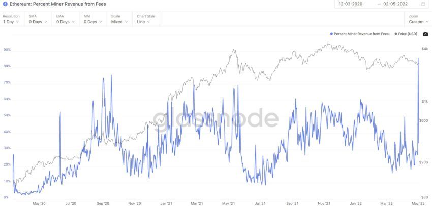 Thu nhập của các thợ mỏ đã tăng đột biến trong vài ngày qua. Dữ liệu cho thấy thu nhập thủ công của các thợ đào đạt 95,182 ETH trong tháng này. Phí xử lý chiếm 85.9% thu nhập. Theo biểu đồ của Glassnode cho thấy, doanh thu của thợ đào Ethereum tăng đáng kể từ đầu tháng 5/2022.