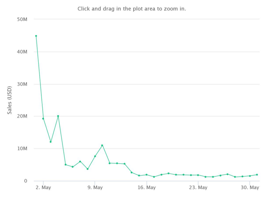 Quay lại tháng 6, đây là tháng đầu tiên trong năm mà MAYC có doanh thu dưới 50 triệu USD. Đây là mức mức thấp mới trong năm 2022, giảm 223,58 triệu USD doanh thu so với tháng 4. Giá trị bán trung bình của MAYC là khoảng 23,683 USD. Đồng nghĩa, giá token đã giảm 74% trong giá trị bán trung bình cho tháng 4 là 92,874.65 USD.