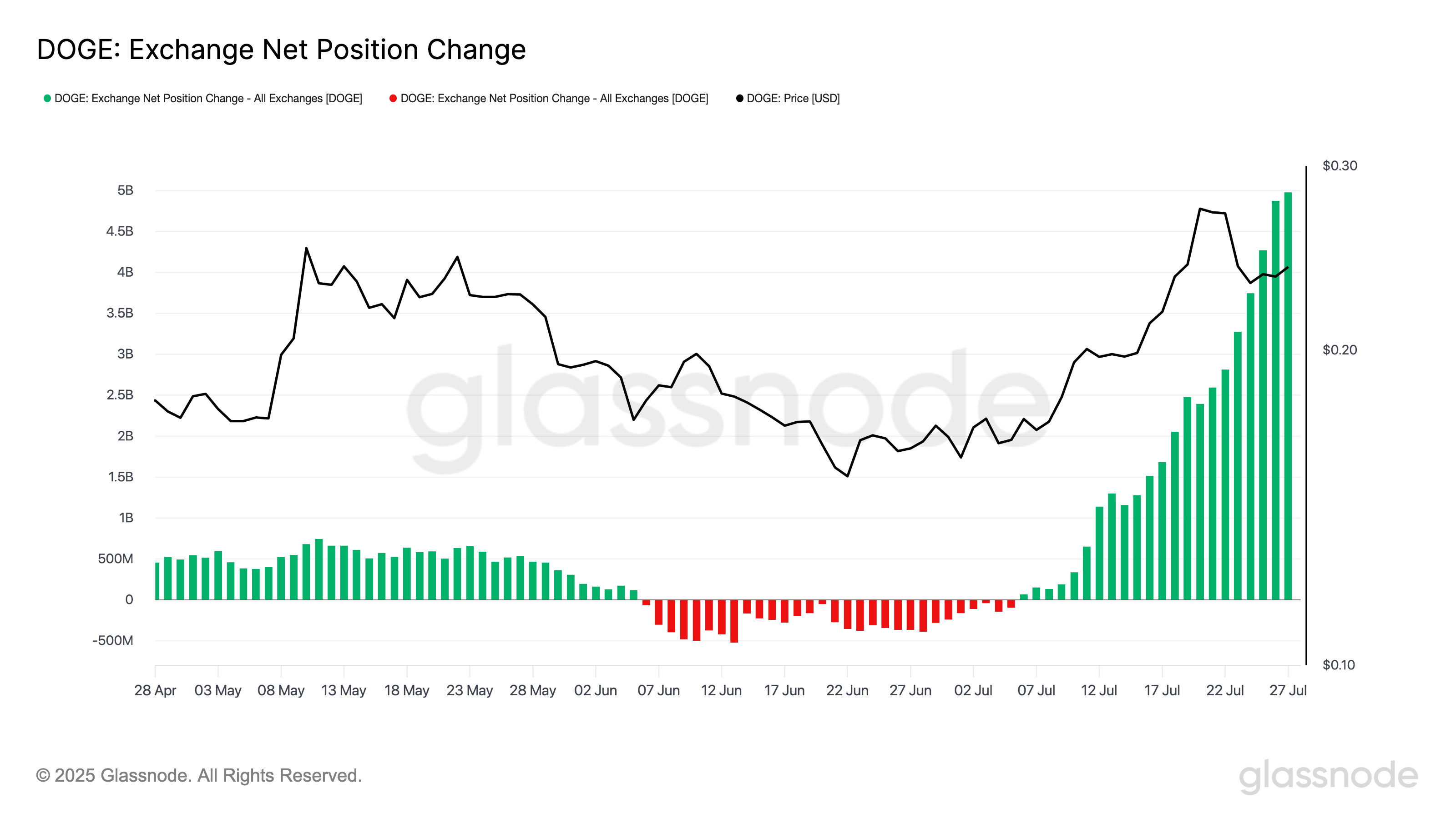 Theo dữ liệu từ nền tảng phân tích on-chain Glassnode, Vị trí Ròng trên Sàn Giao Dịch của DOGE đã tăng đều đặn trong tuần qua, đạt mức cao nhất trong 3 năm là 5 tỷ coin vào Chủ nhật.