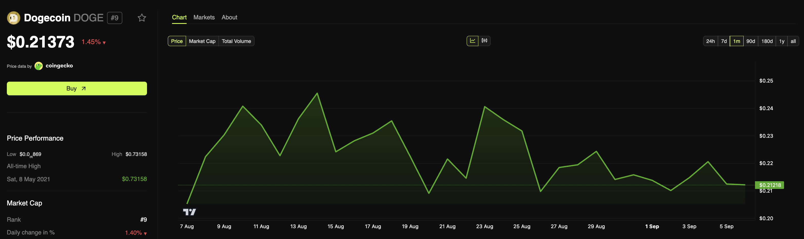 Dữ liệu từ BeInCrypto Market cho thấy DOGE đang giao dịch ở mức 0.213-0.216 USD vào lúc 9:00 sáng UTC. Để đạt được các mức trên, DOGE sẽ cần một đợt tăng mạnh từ giai đoạn tích lũy hiện tại. Mặc dù điều này có thể quá lạc quan, nhưng nó vẫn thu hút sự chú ý, đặc biệt là khi có khả năng REX-Osprey DOGE ETF được chấp thuận.
