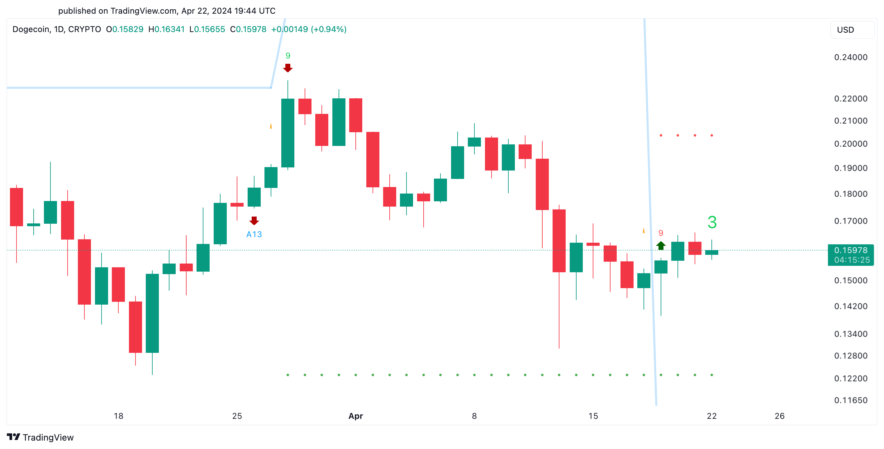 Martinez nhấn mạnh rằng Tom DeMark (TD) Sequential, một chỉ báo kỹ thuật được các nhà giao dịch quan tâm, đã đưa ra tín hiệu mua trên biểu đồ hàng ngày của Dogecoin. Chỉ báo này, được biết đến với việc dự đoán sự đảo ngược xu hướng, cho thấy xu hướng giảm hiện tại của DOGE có thể đang giảm dần, tạo tiền đề cho một đợt tăng đáng kể trong những ngày tới. Điều này có thể cho thấy một cuộc biểu tình kéo dài từ một đến bốn ngày, theo Martinez.