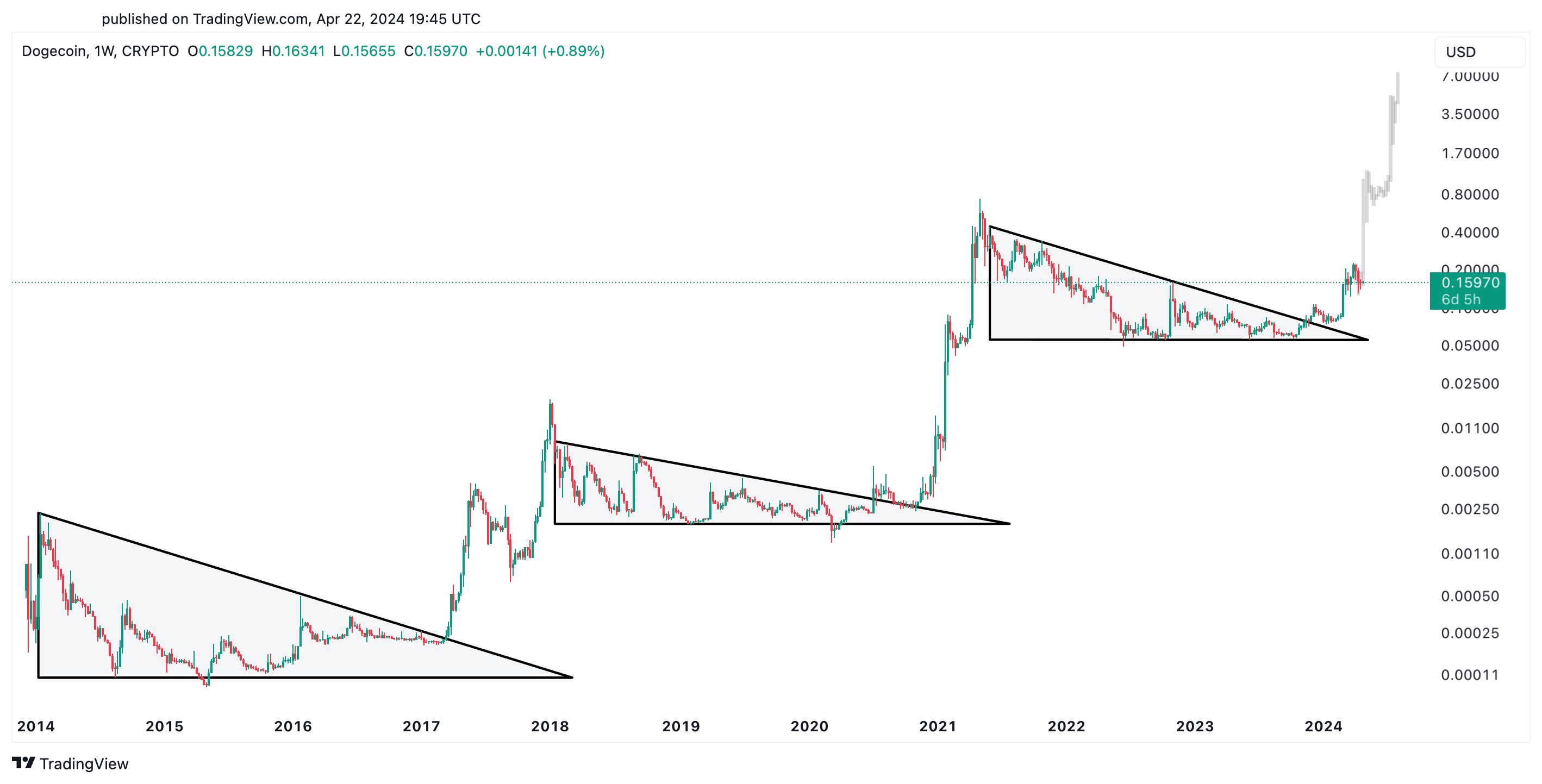 Hiện tại, Dogecoin đang giao dịch ở mức 0.159 USD/token, duy trì quỹ đạo ổn định trong tuần qua. Tuần này DOGE bắt đầu với mức tăng 1.14%, nhưng nhìn vào biểu đồ hàng tuần cho thấy xu hướng mạnh mẽ hơn. Thật vậy, Martinez lưu ý rằng Dogecoin đang bắt chước các mô hình được thấy trong các chu kỳ tăng giá trước đó. Ông chỉ ra rằng một đợt tăng giá parabol mới có thể sắp xảy ra.