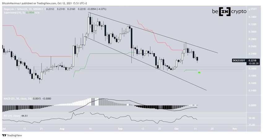 Tuy nhiên, có một vùng hỗ trợ mạnh mẽ cho DOGE ở mức 0.20 USD. Vùng này được tạo ra bởi cả vùng hỗ trợ nằm ngang và đường Supertrend (biểu tượng màu xanh lá cây).