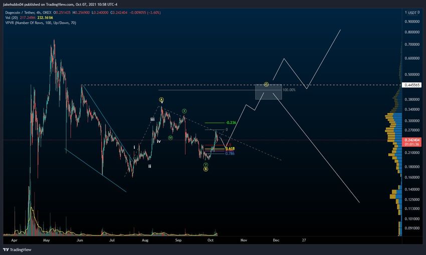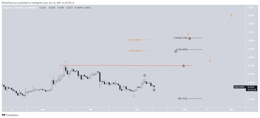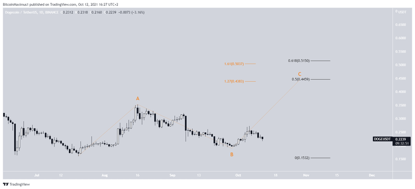 Khả năng đầu tiên gợi ý rằng xu hướng tăng của DOGE sẽ đi theo mô hình điều chỉnh ABC. Điều này có nghĩa là toàn bộ mức tăng là điều chỉnh. Do đó, sau khi hoàn tất, DOGE sẽ giảm xuống mức đáy mới.