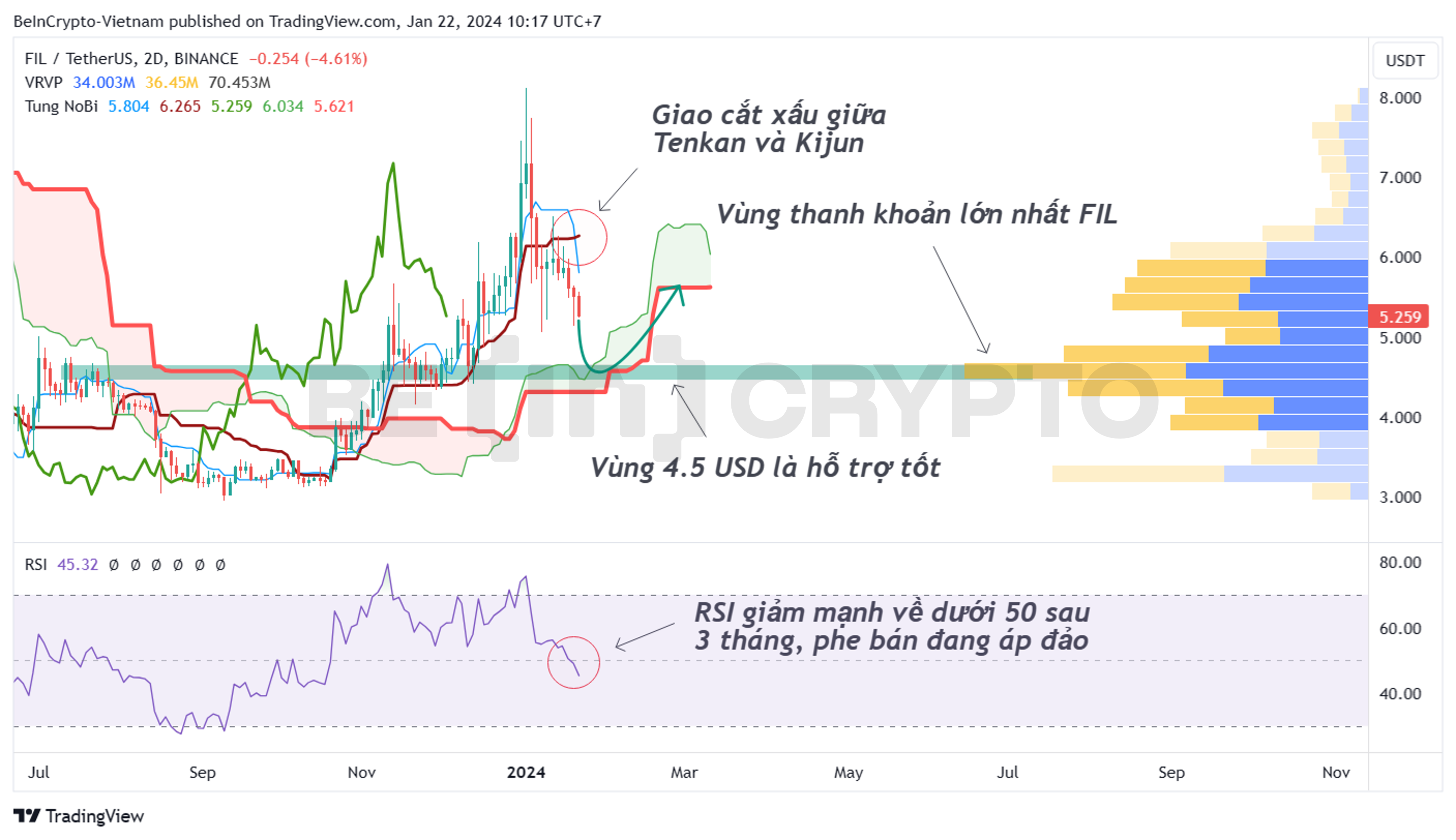 Phân tích kỹ thuật Filecoin (FIL) với Ichikumo và RSI khung 2 ngày (2D) cho thấy những đặc điểm đáng chú ý: