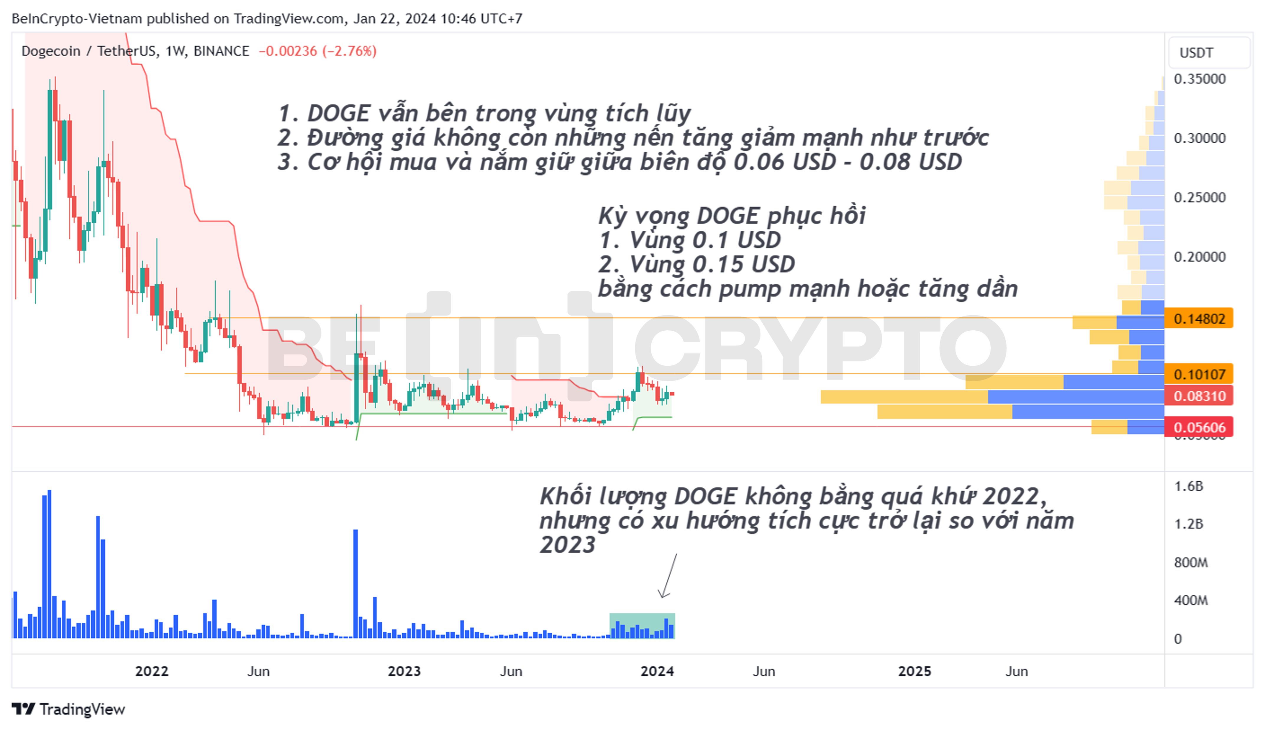 #2. Dogecoin (DOGE) – Không còn “hype” như trước, giá vẫn trong vùng tích lũy lớn