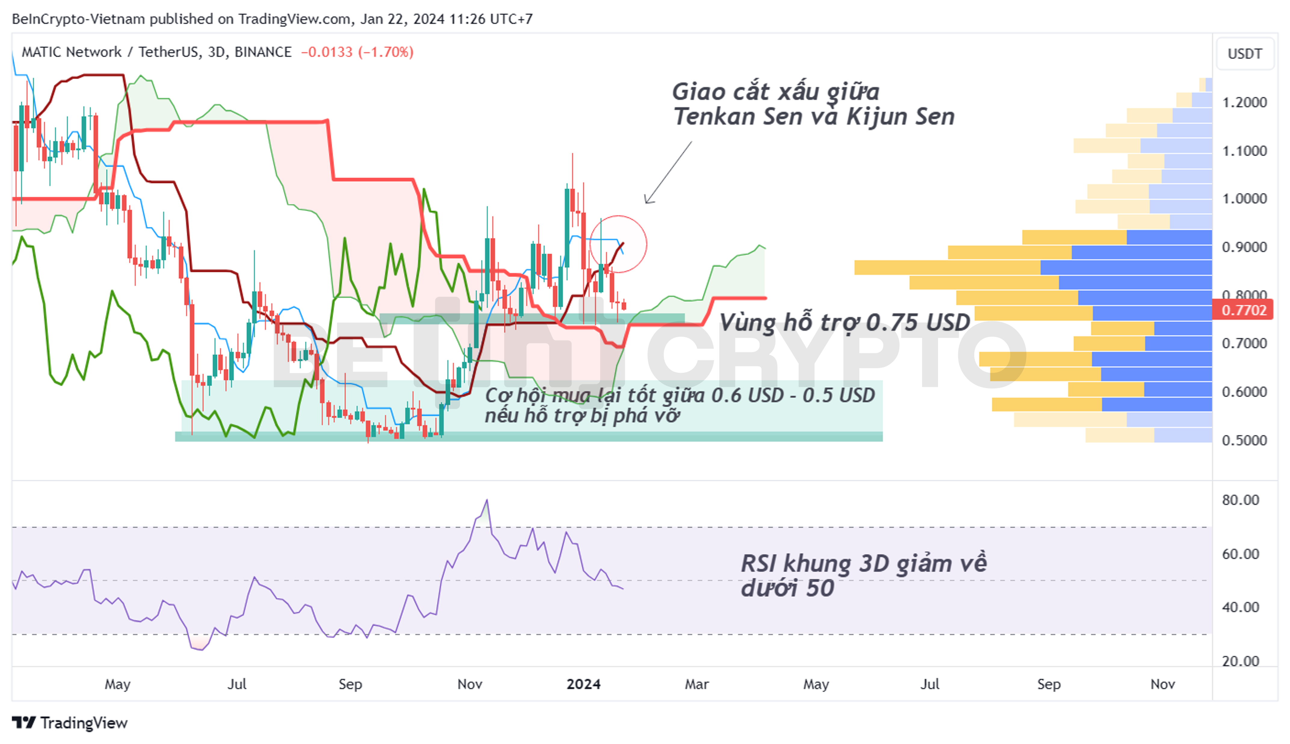 Phân tích kỹ thuật MATIC khung 3 ngày (3D) với chỉ báo Ichimoku, RSI, cho thấy: