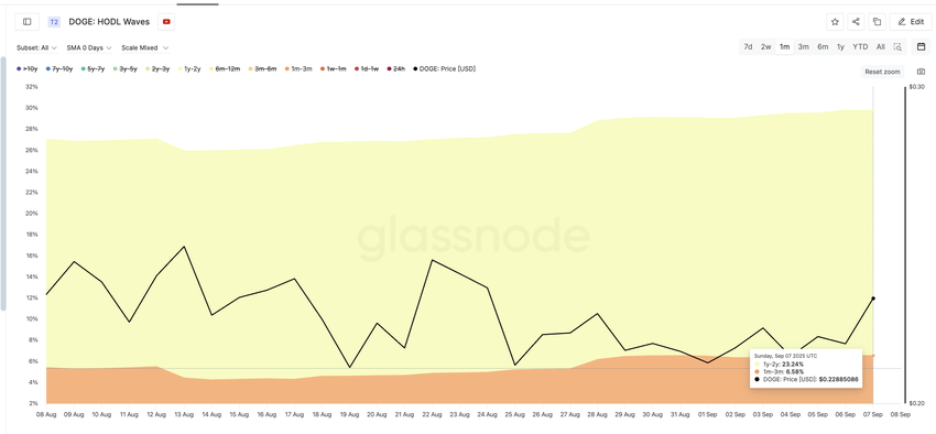 Một trong những dấu hiệu mạnh nhất đến từ HODL waves, theo dõi thời gian các coin được giữ trước khi di chuyển lại. Trong tháng qua, nhóm 1–2 năm đã tăng tỷ lệ từ 21.65% lên 23.24%. Nhóm này thêm vào kho của họ thường được coi là dấu hiệu tăng giá nhất, vì họ thường mua với sự tin tưởng.