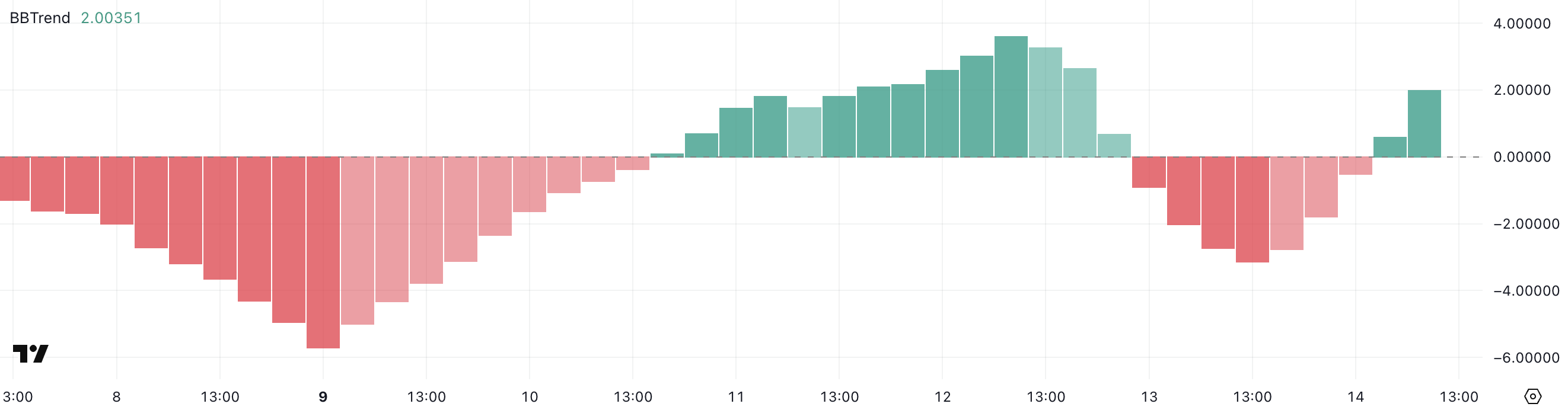 Chỉ báo BBTrend của Dogecoin đã chuyển sang xu hướng tăng mạnh, tăng lên 2 từ -3.14 chỉ một ngày trước.