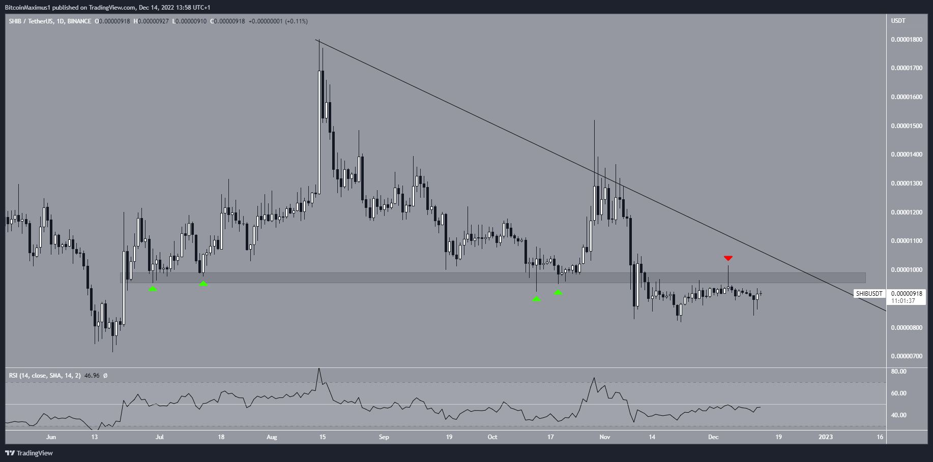 Giá Shiba Inu cũng đã đi theo một đường kháng cự giảm dần. Nó đã tồn tại kể từ ngày 14/8. Vào cuối tháng 10, SHIB đã thực hiện nhiều nỗ lực bứt phá khỏi đường này nhưng không thành công. Kết quả là giá tạo đỉnh thấp hơn và giảm mạnh.