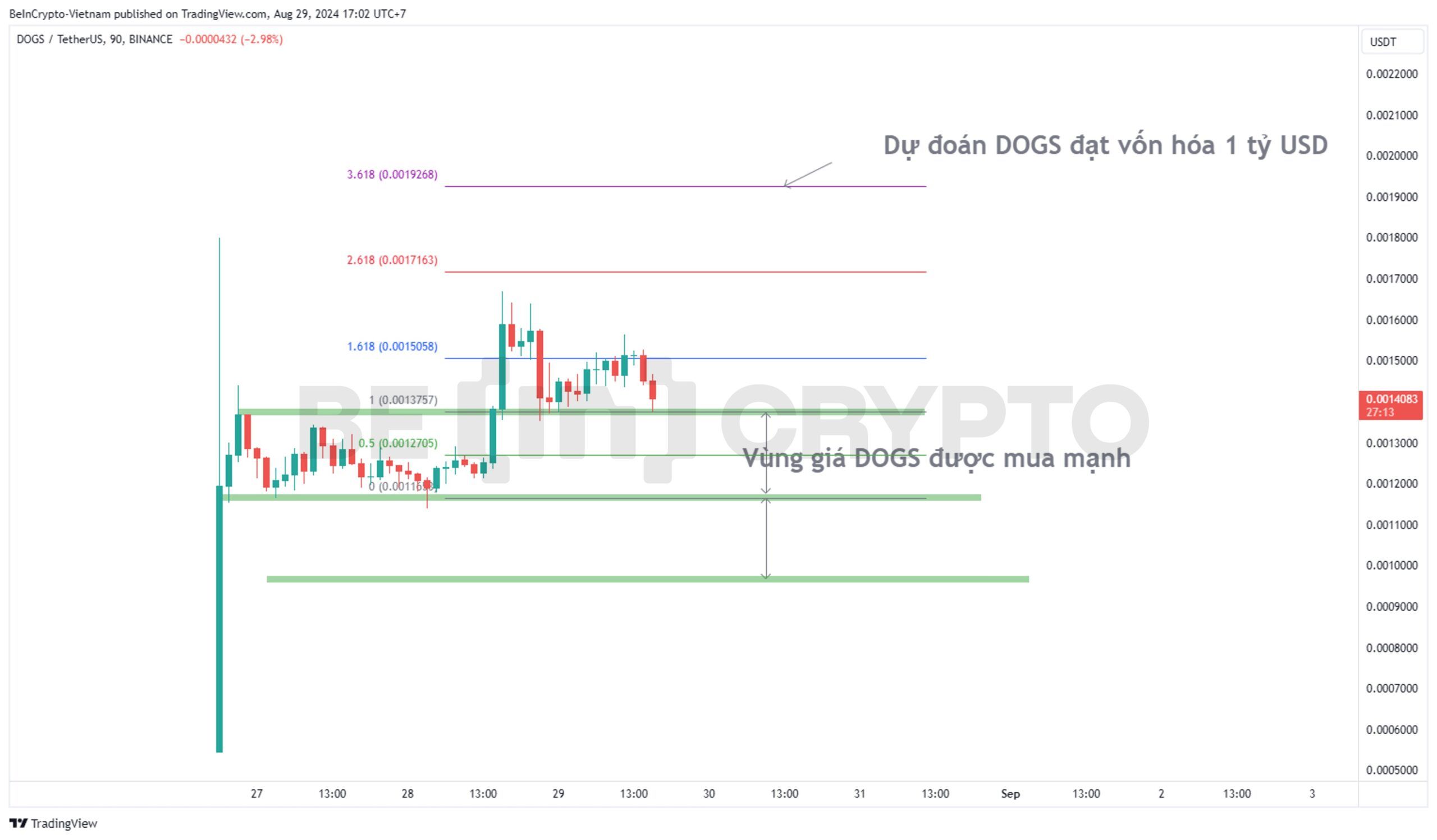 - DOGS đã đạt chinh phục tỷ lệ vàng thứ nhất Fib 1.618 tại 0.0015 USD và gần chạm mức tỷ lệ vàng thứ hai Fib 2.618 tại 0.0017. Dự đoán, với lực mua hiện tại, DOGS có thể tiếp tục chinh phục Fib 3.618 tại 0.0019 USD. Khi đó, vốn hóa của DOGS chính thức đạt 1 tỷ USD.