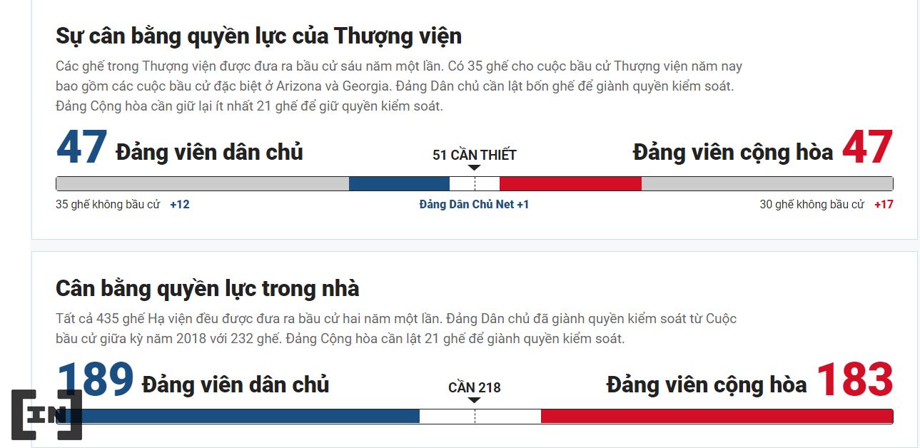 Đến 20 giờ 4.11 tại Việt Nam, số lượng cử tri của hai đảng đã thay đổi đáng kể. Tại thượng viện, cả đảng Dân chủ và đảng Cộng hòa đã cầm hòa với 47 ghế, trong đó đảng Cộng hòa có 17 đảng viên tham gia bầu cử.