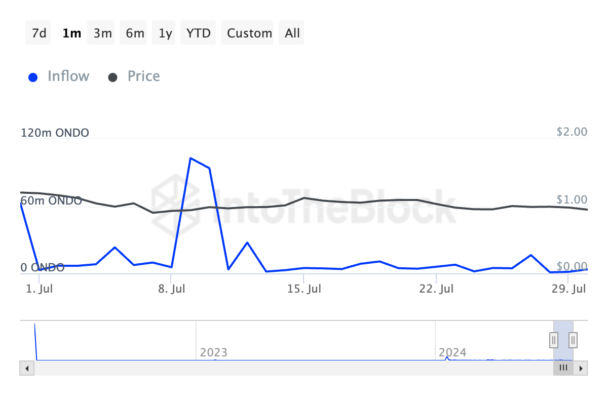 Chỉ số này theo dõi lượng tiền điện tử chảy vào ví của các nhà đầu tư lớn. Khi nó tăng vọt, điều này cho thấy áp lực mua tăng từ các nhà đầu tư quan trọng. Nếu các nhà đầu tư lớn ONDO tiếp tục tích lũy Altcoin này vào tháng 8, giá của nó có thể tăng lên 0.99 USD.