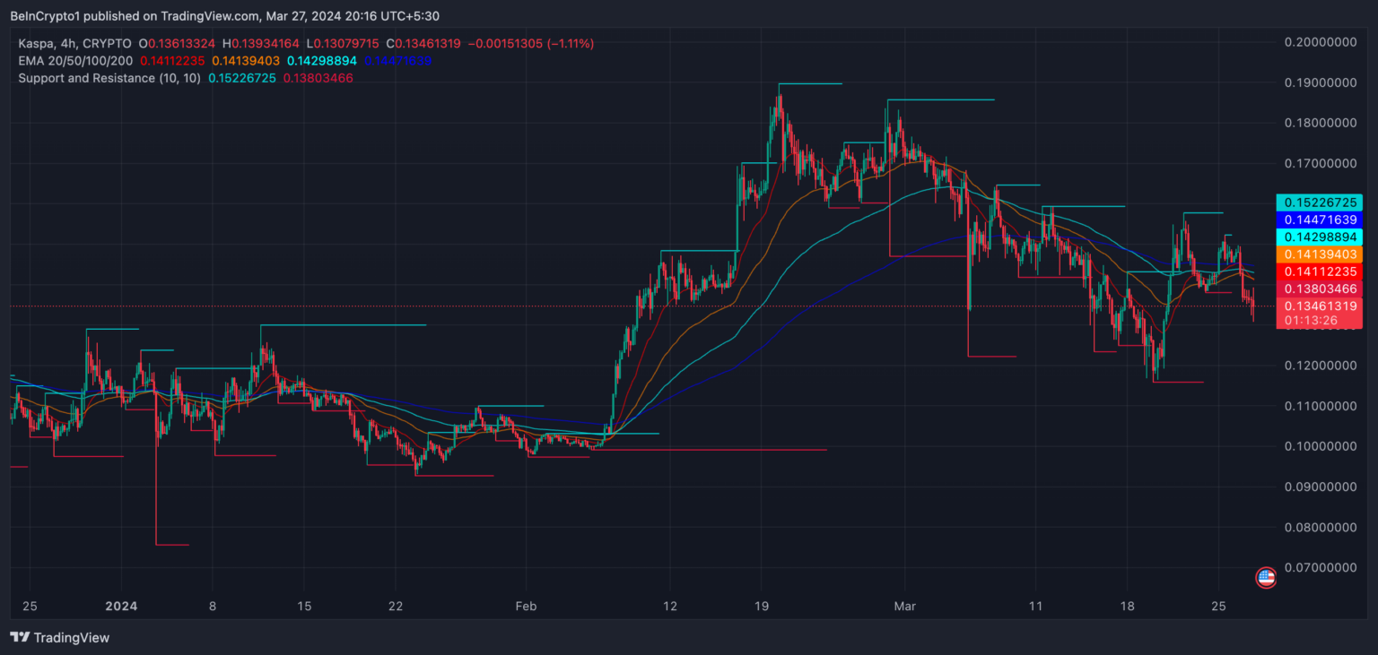 Sự suy thoái của KAS bắt đầu vào ngày 04/3. Các đường EMA ngắn hạn giảm xuống dưới các đường EMA dài hạn, dẫn đến giá giảm cho đến ngày 20/3. Vào ngày 26/3, một điểm Death Cross mới hình thành. Chỉ báo này thường báo hiệu giá KAS sẽ giảm nhiều hơn. Death cross gợi ý nhiều sự suy giảm hơn. Giá của KAS có thể giảm xuống 0.099 USD hoặc thậm chí 0.075 USD.