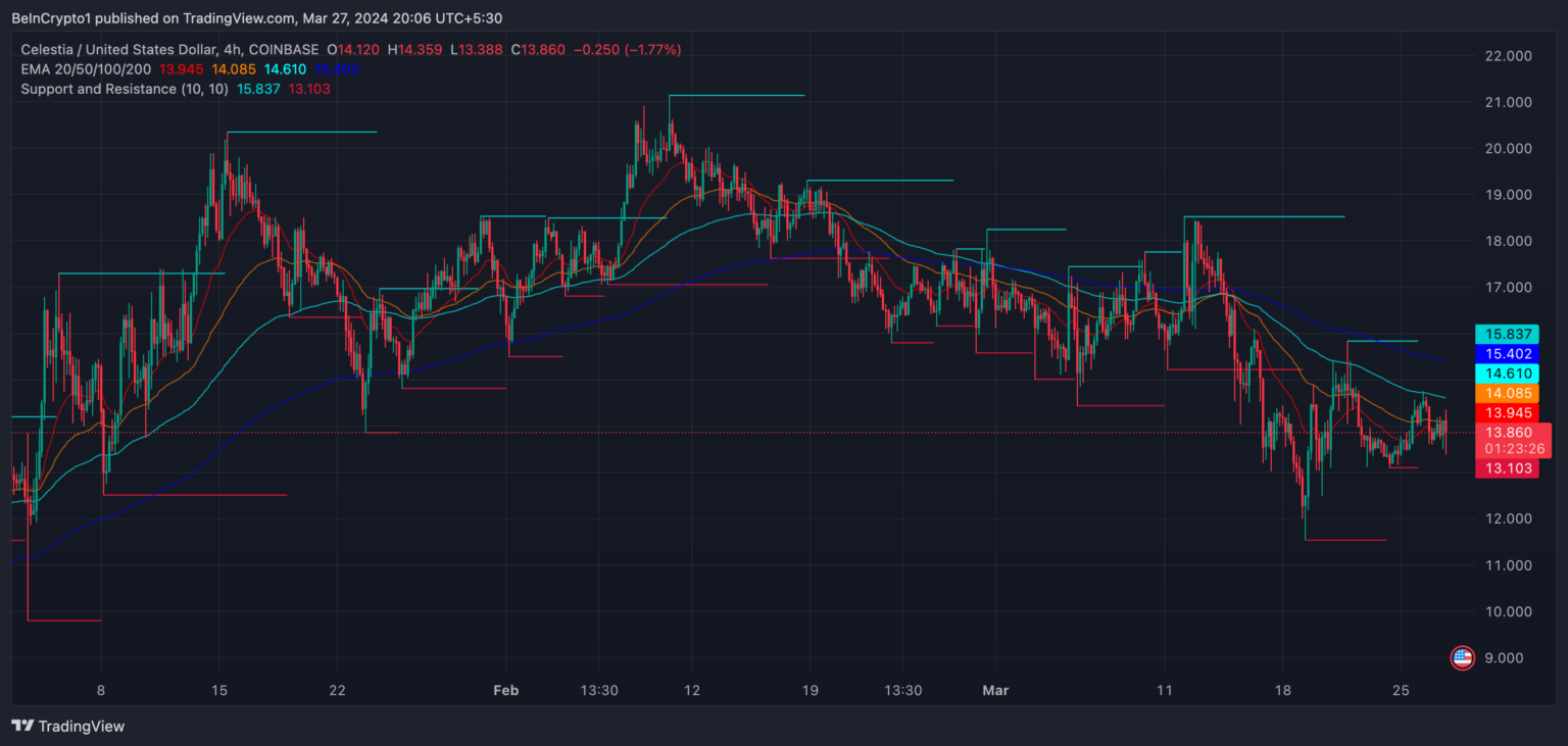 Celestia (TIA), một mạng mô-đun tập trung vào việc cung cấp các giải pháp tạo chuỗi khối, đã đạt mức cao nhất mọi thời đại (ATH) là 20.77 USD vào ngày 10/2. Sau đó, một sự điều chỉnh mạnh mẽ được ghi nhận với mức giá chạm 13.8 USD vào ngày 27/3. Mặc dù là một trong những blockchain mô đun lớn nhất hiện tại nhưng giá TIA dường như đã không theo kịp sự gia tăng chung của tiền điện tử vào năm 2024. YTD của nó là dưới 1% trong năm nay.