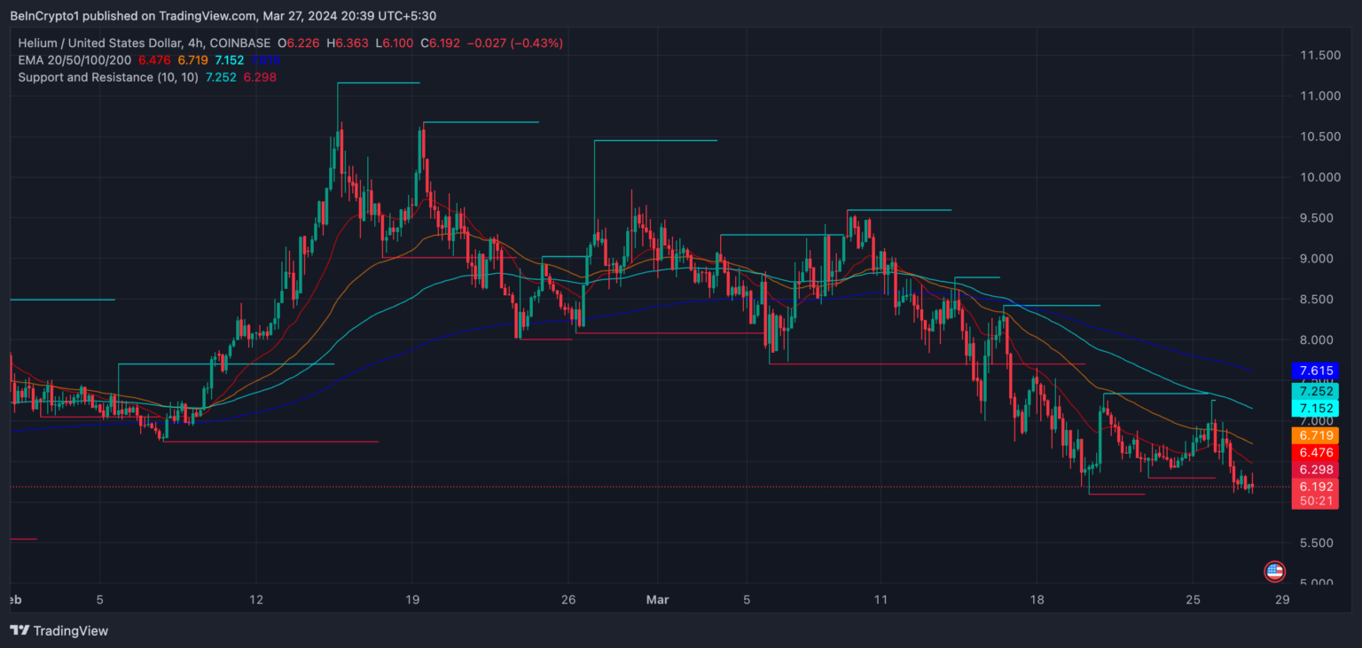 Thực tế là HNT đã không tiến gần hơn đến ATH của nó, ngay cả với tất cả sự cường điệu xung quanh DePIN và sự tăng trưởng chung của tiền điện tử vào năm 2024, chắc chắn đã đặt ra một số cảnh báo đỏ cho các nhà đầu tư, vì đồng tiền này có thể đã mất đà. Vào ngày 11/3, các đường EMA ngắn hạn của nó đã cắt xuống dưới các đường EMA dài hạn, tạo thành một điểm Death Cross. Sau đó, giá HNT bắt đầu rơi tự do. Nó phục hồi một thời gian ngắn vào ngày 20/3, nhưng xu hướng giảm vẫn tiếp tục và giá HNT hiện tại.