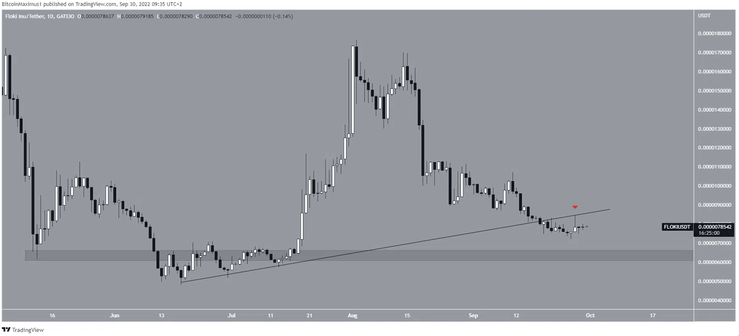 Sponsored SponsoredFLOKI đã giảm kể từ khi đạt mức cao vào ngày 2/8. Xu hướng đi xuống vẫn đang tiếp diễn. Vào ngày 18/9, giá đã phá vỡ khỏi đường hỗ trợ tăng dần và xác nhận nó là mức kháng cự vào ngày 27/9 (biểu tượng màu đỏ). Nếu một xu hướng giảm khác xảy ra sau đó, vùng hỗ trợ gần nhất sẽ là 0.0000065 USD.
