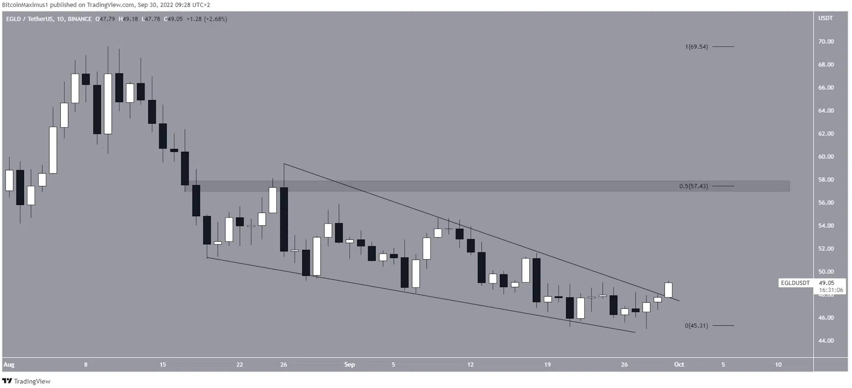 EGLD đã giảm bên trong một nêm giảm dần kể từ ngày 18/8. Sau khi củng cố trong hơn một tháng, giá bắt đầu đi lên vào ngày 28/9 và bùng nổ hai ngày sau đó. Nếu xu hướng tăng tiếp tục, vùng kháng cự gần nhất sẽ là 57.5 USD. Đây là vùng kháng cự nằm ngang và mức kháng cự thoái lui 0,5 Fib.