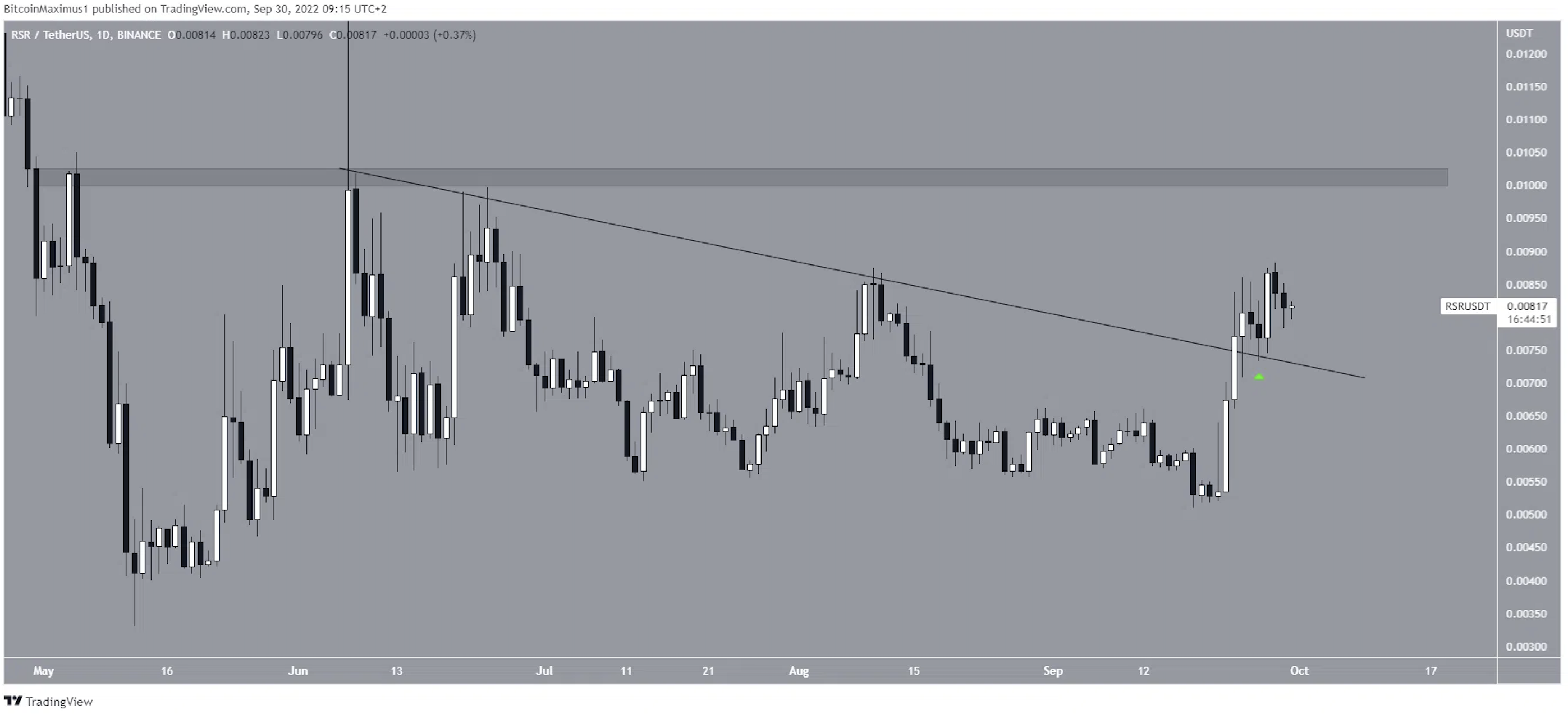 Giá của RSR đã bứt phá khỏi đường kháng cự giảm dần vào ngày 23/9 và xác nhận nó là hỗ trợ 3 ngày sau đó (biểu tượng màu xanh lá cây). Giá đã tăng kể từ đó và tạo ra một hình nến nhấn chìm tăng giá vào ngày 27/9. Nếu xu hướng tăng tiếp tục, vùng kháng cự gần nhất tiếp theo sẽ là 0.012 USD.