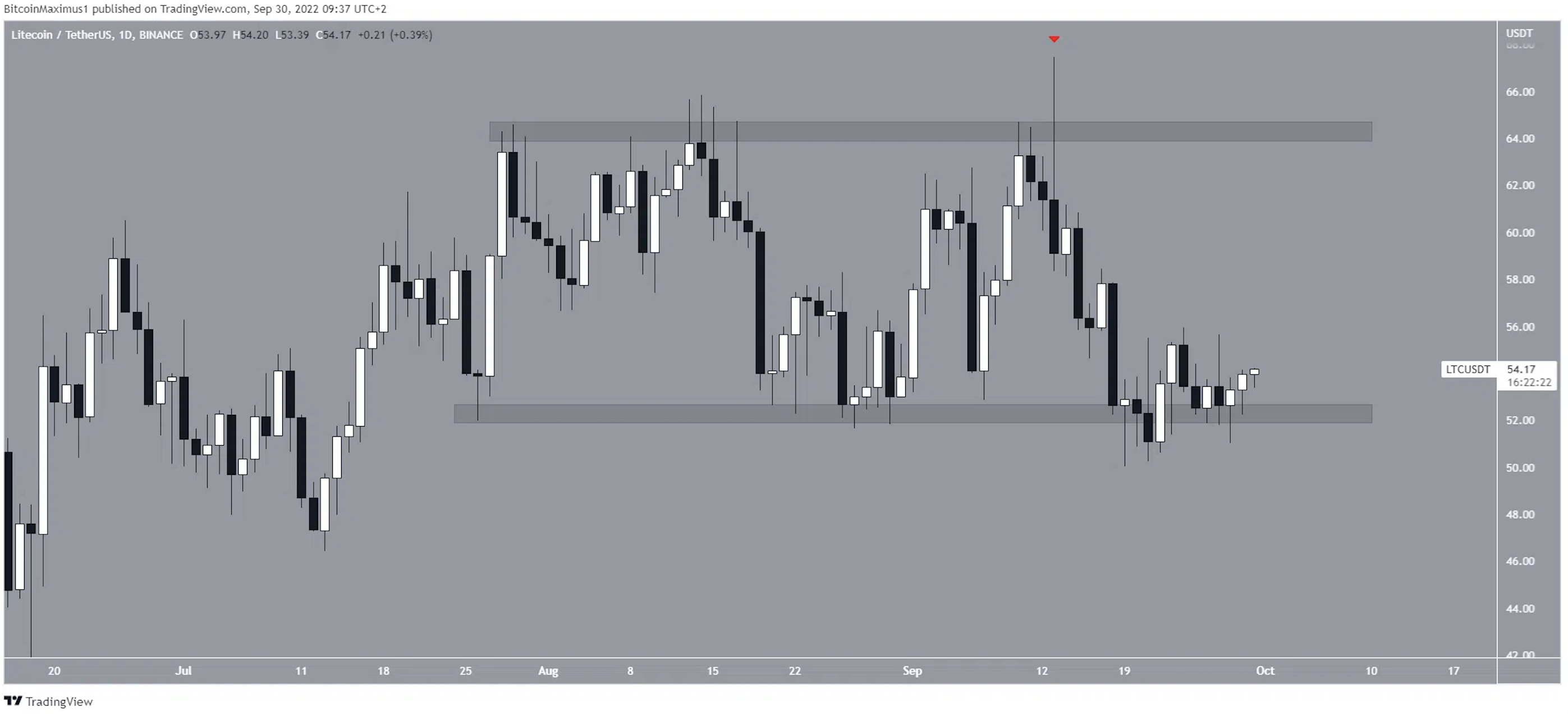 Trong khoảng thời gian từ ngày 29/7 đến ngày 13/9, LTC đã tạo mô hình 3 đỉnh bên dưới vùng kháng cự ngang 64 USD. Đỉnh thứ ba cũng tạo ra một bấc trên rất dài, một dấu hiệu của áp lực bán. Vào ngày 19/9, LTC đã đạt đến vùng hỗ trợ ngang 52 USD và bật lên. Do đó, nó hiện đang giao dịch trong phạm vi từ 52 USD đến 64 USD.