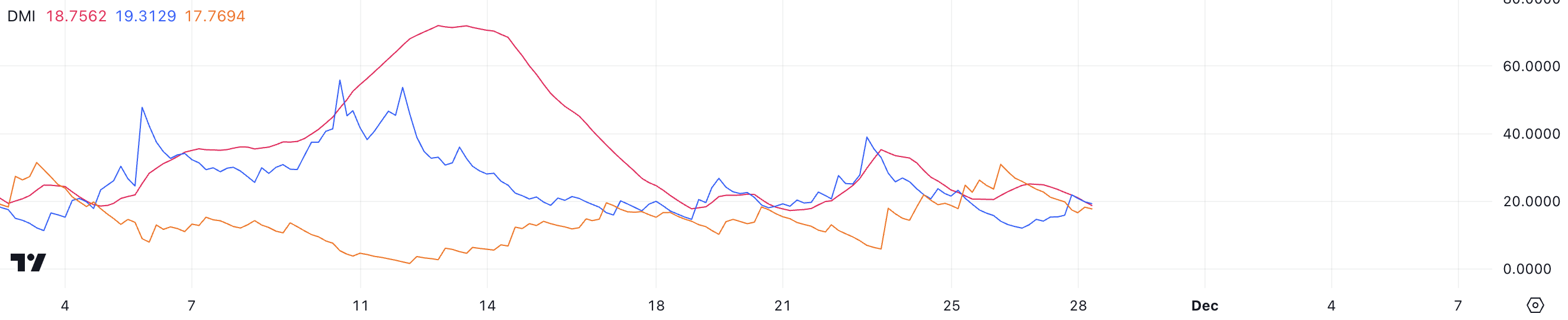 Biểu đồ DMI của DOGE cho thấy ADX của nó đã giảm xuống 18.7 từ 25 chỉ trong một ngày, báo hiệu xu hướng đang yếu đi. ADX, hay Chỉ số Định hướng Trung bình, đo lường sức mạnh của một xu hướng, bất kể hướng nào, trên thang điểm từ 0 đến 100.