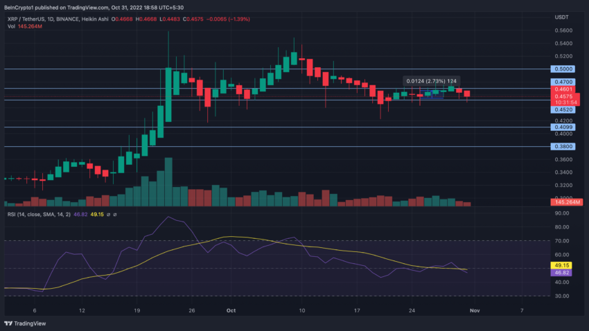 Nhìn vào biểu đồ ngày của XRP. Rõ ràng là đồng coin này đã di chuyển trong một động lượng giới hạn trong phạm vi giữa mốc 0.47 USD và 0.452 USD. Hơn nữa, khối lượng giao dịch từ các nhà đầu tư nhỏ lẻ đã không được đề cập đến trong khi RSI cho thấy phe bán đang thống trị thị trường.