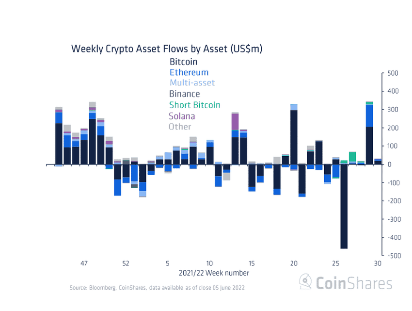 Đối với Ethereum, tổng dòng tiền chảy vào tài sản này trong tuần vừa qua là 120 triệu USD. Với bản cập nhật Merge sắp tới, sự quan tâm của nhà đầu tư đối với Ethereum đang dần trở lại.
