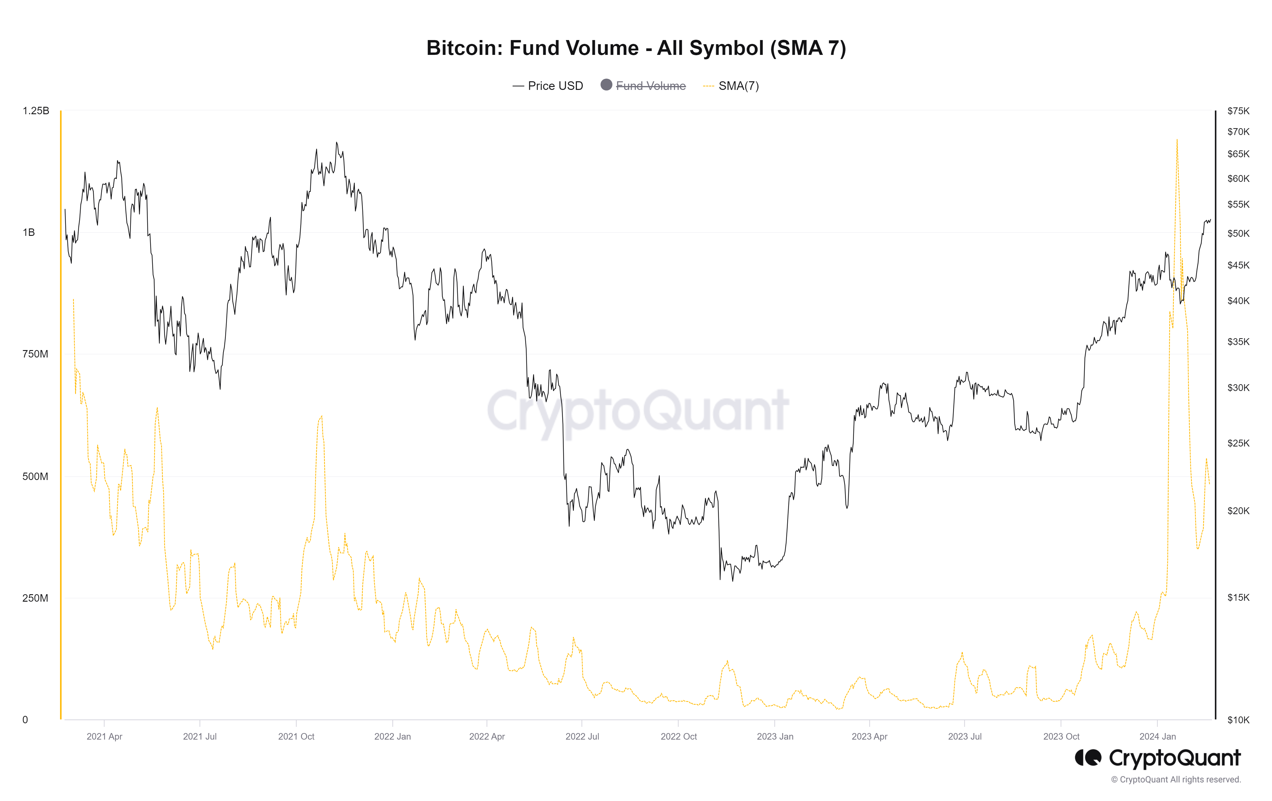 Dữ liệu từ CryptoQuant thống kê khối lượng giao dịch từ các quỹ, cho thấy sự gia tăng đột biến trong năm 2024, và tiếp tục duy trì cho đến tháng 2 này.