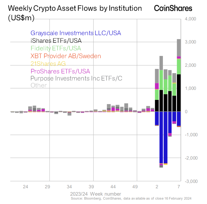 Trong số tiền inflow này, thì Hoa Kỳ đã chiếm 99%, tương đương 2.4 tỷ USD. Không khó đoán, dòng tiền mới này đến từ các quỹ ETF giao ngay đã được thông qua từ giữa tháng 1. Rõ ràng, Bitcoin ETF giao ngay đã khiến cho giá Bitcoin bước sang một chương mới, vì nhu cầu ETF là không thể xem thường.