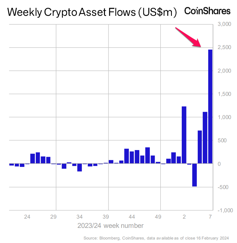 Coinshares cho biết, các sản phẩm đầu tư tài sản kỹ thuật số đã chứng kiến dòng vốn trong tuần qua cao kỷ lục, lên đến 2.45 tỷ USD. Nếu tính từ đầu năm đến nay, thì dòng vốn đầu tư từ các quỹ ở mức ấn tượng, đến 5.2 tỷ USD.