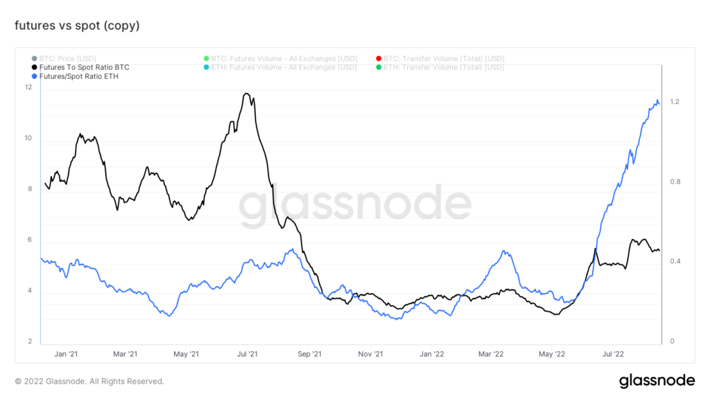 Tỷ lệ này càng tăng chứng tỏ phái sinh được giao dịch nhiều hơn spot. Tháng 8 này, làn sóng phái sinh rõ ràng sôi động hơn cả năm 2022. Đặc biệt, khối lượng phái sinh ETH tăng cao trước thềm The Merge. Nếu nhà đầu tư kỳ vọng tích cực vào nâng cấp The Merge sao không mua ETH trên Spot mà lại đổ vốn đặt cược trong phái sinh? Câu hỏi này rất đáng để suy ngẫm.