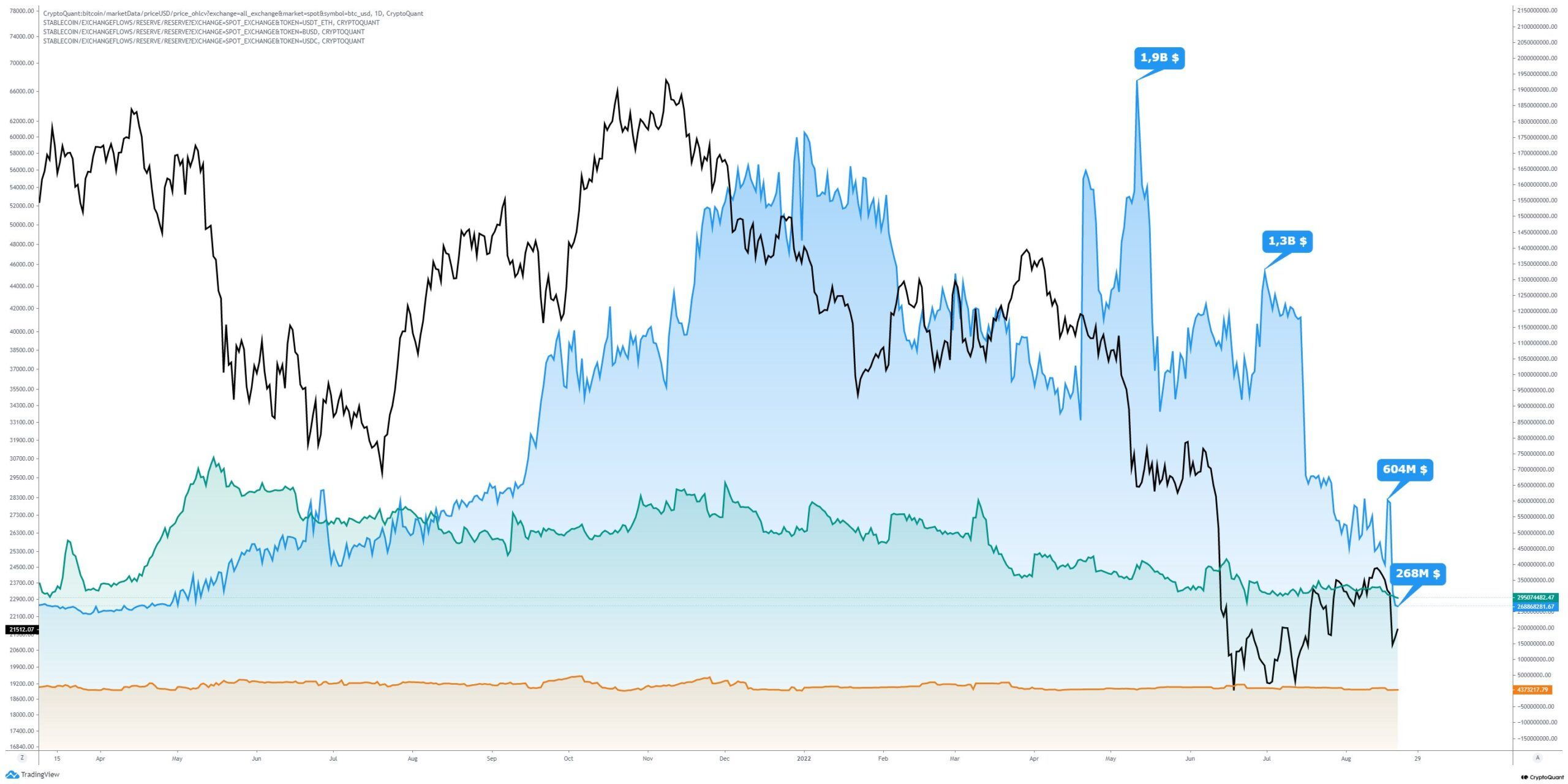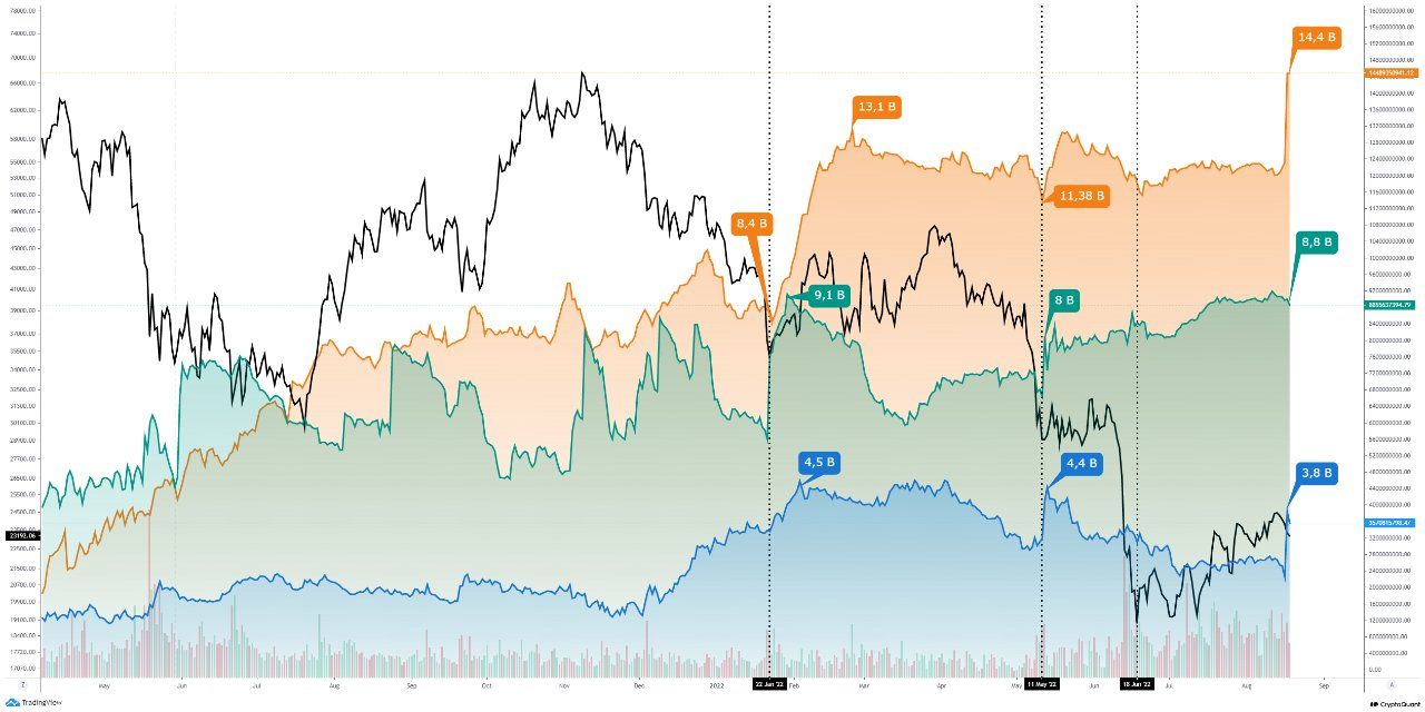 Một phần stablecoin được sử dụng để Buy khi giá ngày càng giảm mạnh. Phần còn lại, biểu đồ trên cho thấy chúng được nạp phái sinh từ giữa tháng 8 này một cách đột biến thấy rõ. Trước đó, BeInCrypto đã tường thuật việc 3.6 tỷ USD giá trị stablecoin nạp lên phái sinh và 18,000 BTC lên các sàn spot, ngay trước khi BTC dump về dưới 21,000 USD.