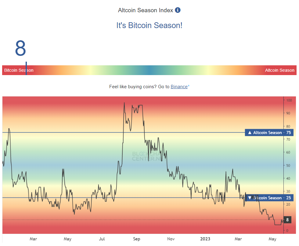 Theo Blockchain Center, biểu đồ trên đây cho thấy chỉ số Altcoin Season Index đang ở mức 8. Nó báo hiệu đây là mùa Bitcoin, không phải Altcoin. Lục về dữ liệu trong lịch sử, chúng ta thấy có 2 thời điểm khi chỉ số này dưới mức 25. Cụ thể: