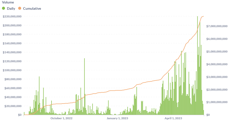 Theo dữ liệu BeInCrypto ghi nhận từ giao thức, khối lượng cho MUX đã không ngừng tăng lên. Hiện khối lượng giao dịch đang ở mức tích lũy 7.8 tỷ USD và 700 triệu USD trong 7 ngày qua. Phí từ giao thức này liên tục nằm trong top 5 cho các công cụ phái sinh lớn nhất trên thị trường hiện nay.