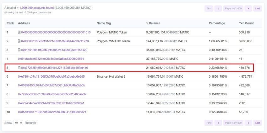 Một dự án MLM Ponzi của Trung Quốc đã trở thành cá voi MATIC lớn thứ 5. Các giao dịch của dự án là nguyên nhân dẫn đến sự gia tăng lớn về phí gas trên mạng Polygon.