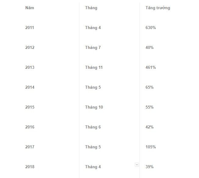 Ngoài 2011 và 2013, tăng trưởng giá của Bitcoin thường khá thấp, không đạt mức tăng trưởng 100%. Mức tăng trưởng cao nhất theo tháng của Bitcoin được chỉ rõ trong bảng dưới đây.
