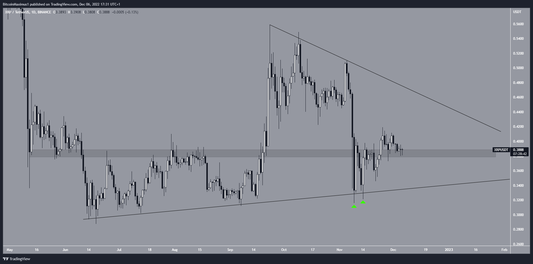 Sau đó, giá XRP đã lấy lại khu vực nằm ngang 0.385 USD. Trong 24 giờ qua, nó đã được xác nhận là hỗ trợ. Nếu giá XRP thành công trong việc duy trì trên hỗ trợ, thì dự kiến sẽ có một chuyển động đi lên đối với đường kháng cự giảm dần ở mức 0.43 USD. Ngược lại, giá XRP có thể giảm xuống đường hỗ trợ tăng dần ở mức 0.35 USD.