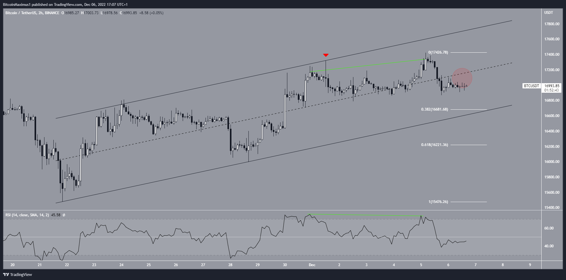 Đường giữa của kênh (vòng tròn màu đỏ) hiện được cho là sẽ cung cấp mức kháng cự. Vùng hỗ trợ gần nhất là 16,680 USD, mức hỗ trợ thoái lui Fibo 0.382 và đường hỗ trợ của kênh. Nếu xảy ra sự đột phá, vùng hỗ trợ gần nhất tiếp theo sẽ là 16,220 USD, mức hỗ trợ ngang và thoái lui Fibo 0.618. Ngược lại, một sự đột phá từ kênh song song tăng dần sẽ làm mất hiệu lực dự báo giá tiền điện tử Bitcoin.