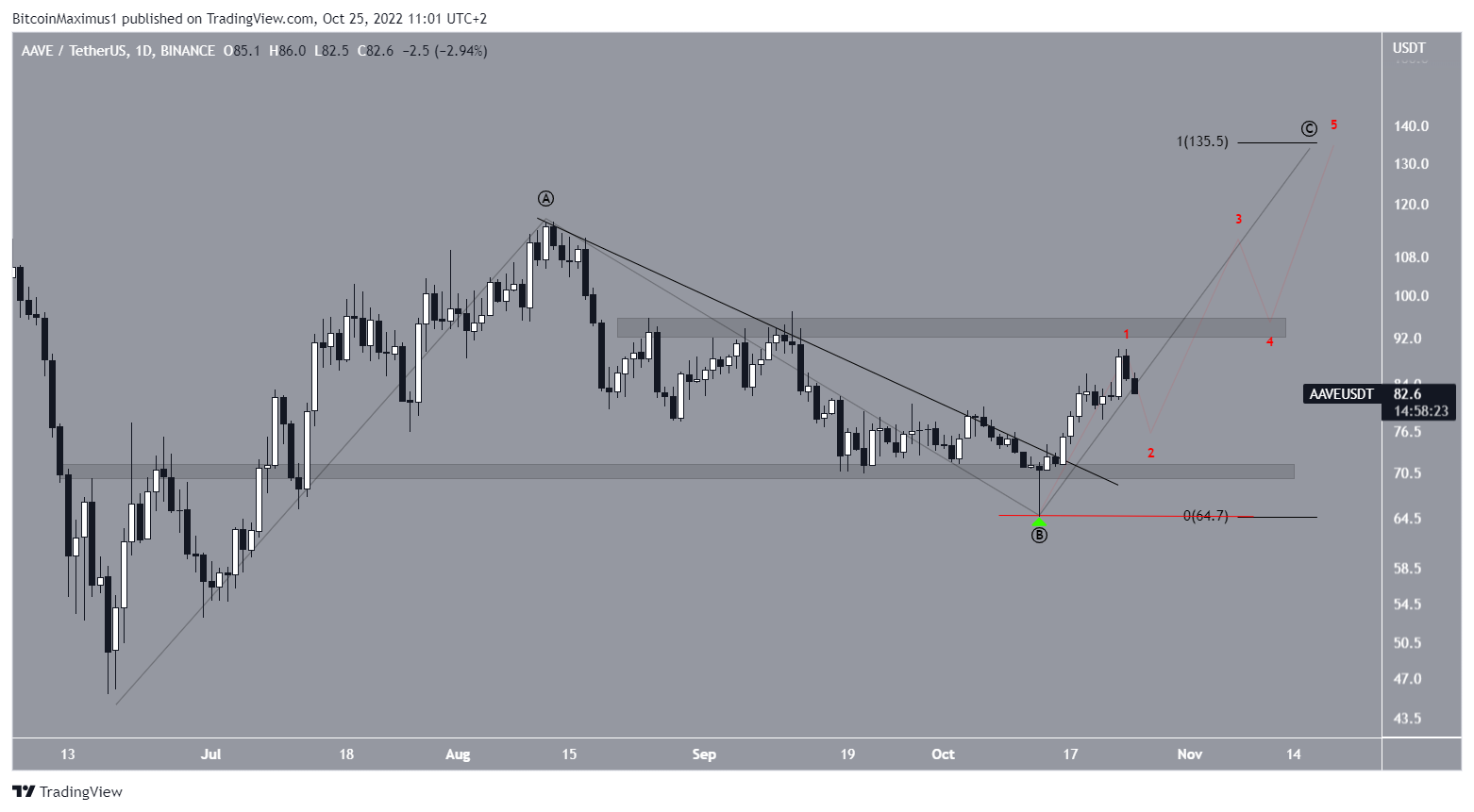 Tương tự như RSI, số lượng sóng cho thấy triển vọng tăng giá. Nó cho thấy giá AAVE có khả năng nằm trong sóng C của cấu trúc điều chỉnh A-B-C (màu đen). Nếu vậy, việc cho các sóng A:C theo tỷ lệ 1:1 sẽ dẫn đến dự đoán giá trong tương lai AAVE là 135.50 USD. Số lượng sóng phụ được cho bằng màu đỏ.