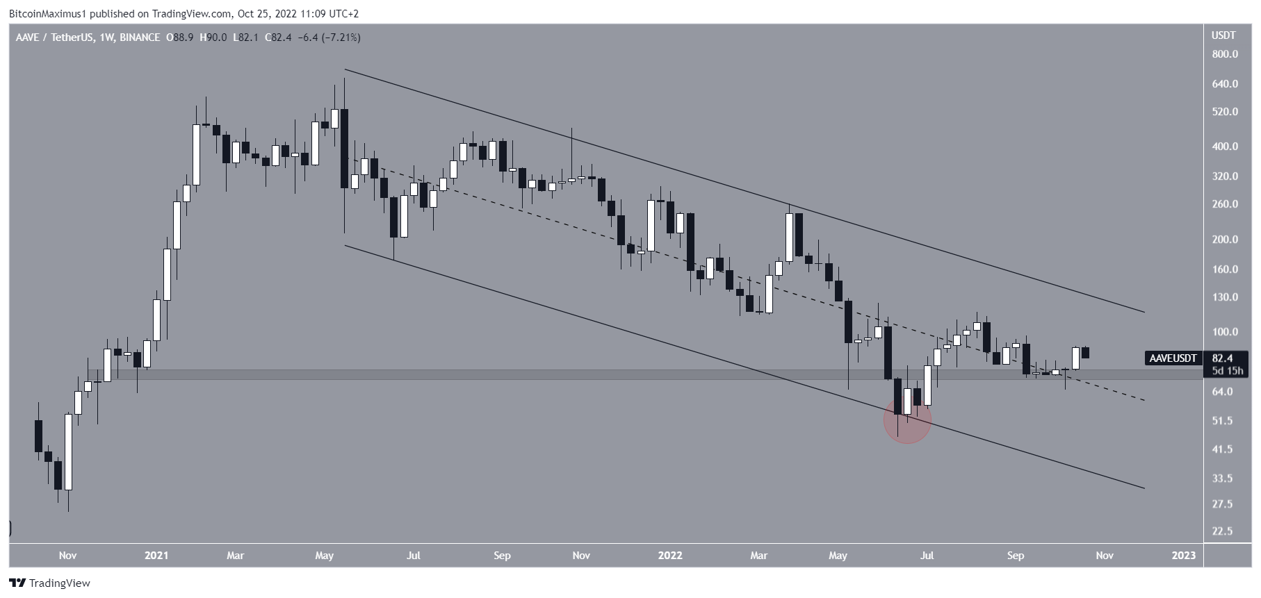 Vào tháng 6/2022, giá AAVE đã phá vỡ dưới vùng hỗ trợ ngang dài hạn 71 USD. Nó cũng xác nhận đường hỗ trợ của một kênh song song giảm dần trong dài hạn (vòng tròn màu đỏ). Tuy nhiên, nó đã đảo ngược xu hướng ngay sau đó, lấy lại khu vực trên trong quá trình này. Những sai lệch như vậy theo sau bởi sự phục hồi được coi là sự phát triển tăng giá và thường dẫn đến các chuyển động đi lên.